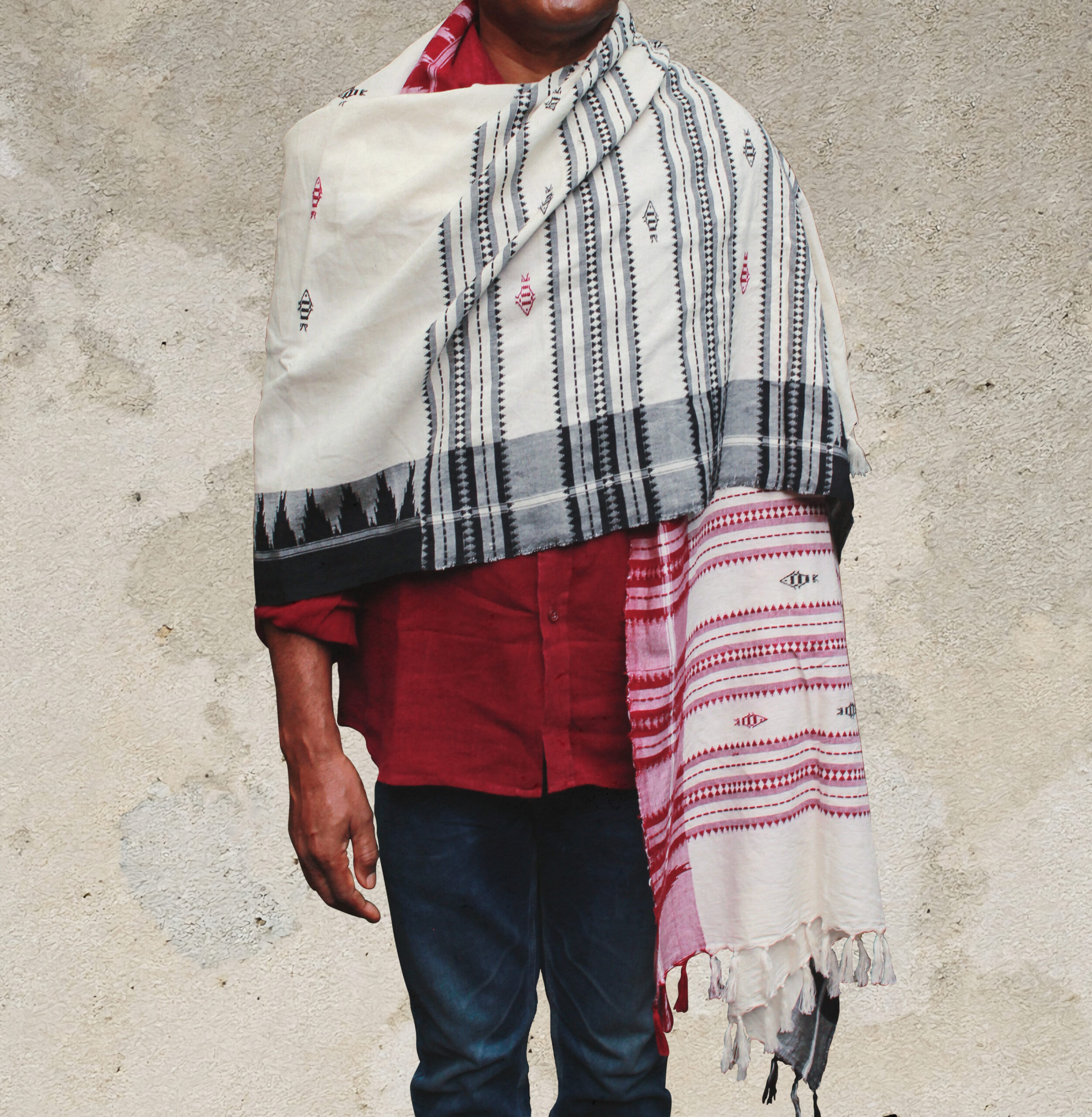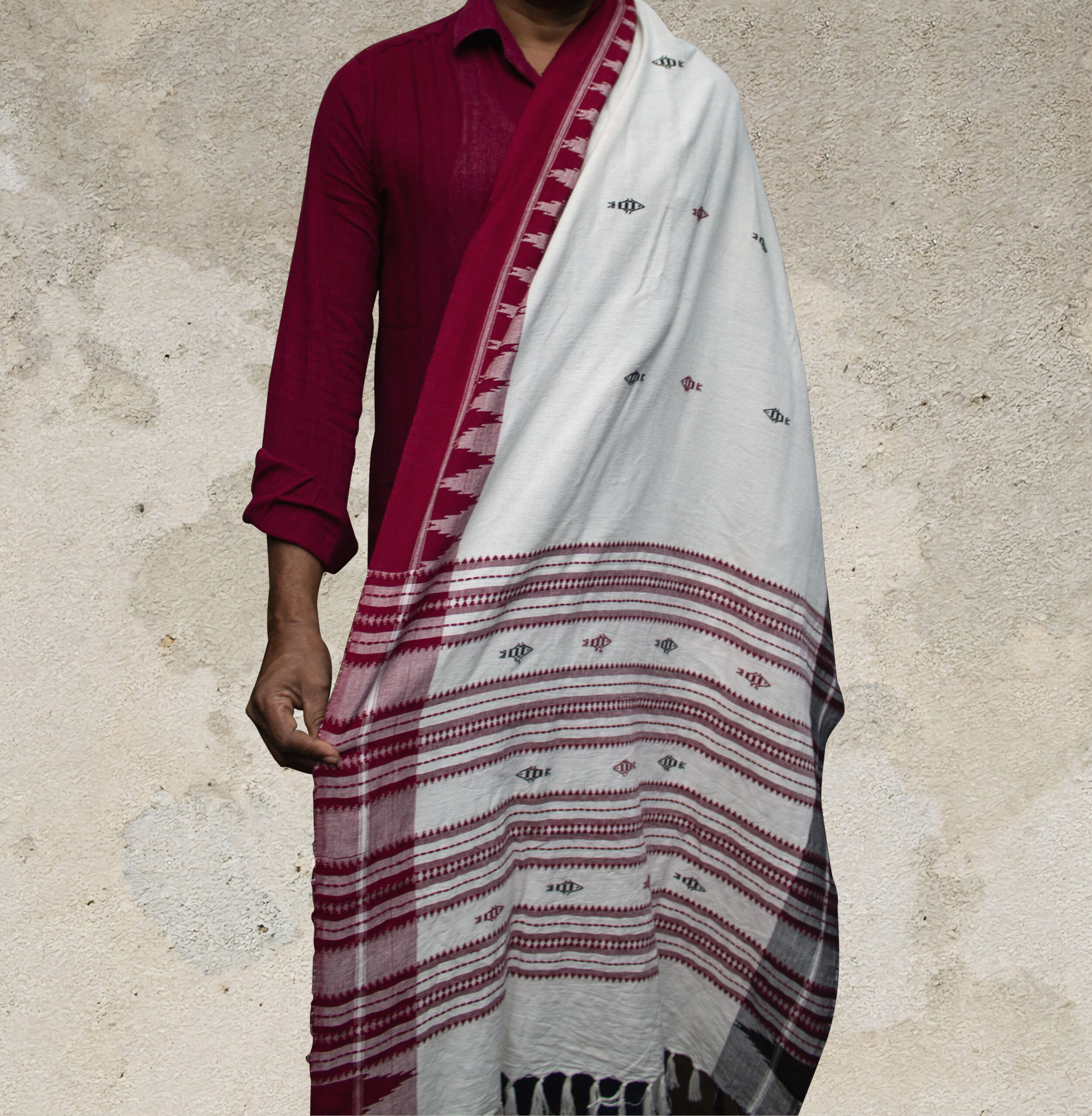 Red and White Dupatta with Fish Motifs in Red Tribal Motif